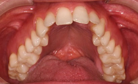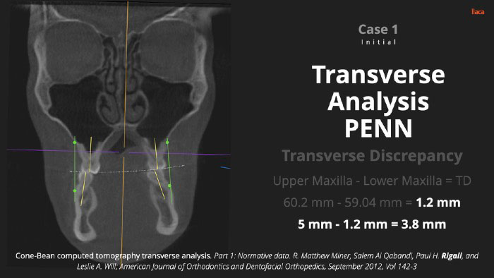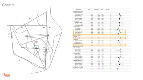 The extraoral examination revealed a long facial type with an increased lower facial third, nasolabial folds accentuated by insufficient midface support, and broad buccal corridors due to maxillary compression. Intraoral analysis showed a posterior crossbite, negative torque on posterior teeth, and an altered occlusal balance. Radiographic and cephalometric evaluation confirmed the clinical findings, with an increased mandibularplane angle and mandibular posterior rotation. This rotation contributed to a convexity of +4 mm, although the underlying problem was a retruded maxilla with insufficient midface support. Vertical facial height was also increased. Importantly, the temporomandibular joint evaluation showed a posterior condylar position with intact cortical bone, no pain, and no joint sounds.