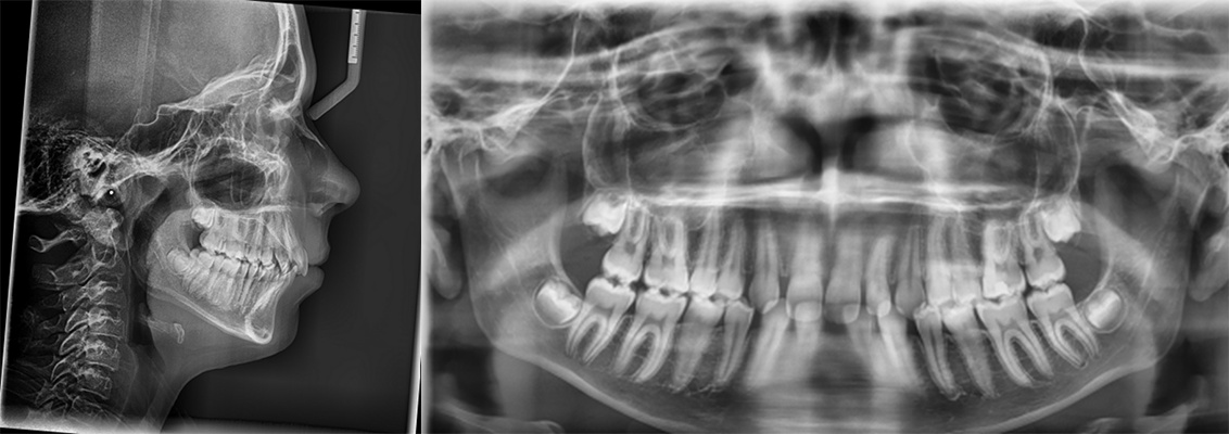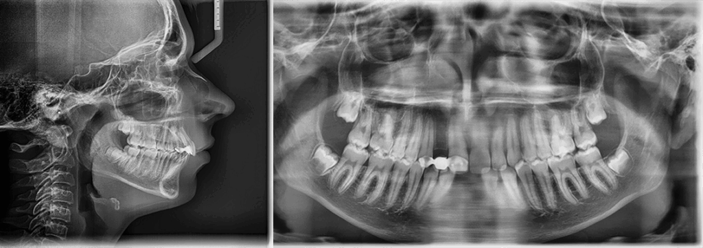 Skeletal Class II due to mandibular retrognathia, proclination of maxillary incisors, narrow arch creating a V-shaped arch, agenesis of 12, 31, 41, hyperdivergent facial pattern, moderate deep bite (2 mm), increased overjet (9 mm), asymmetric canine and molar Class II due to mandibular deviation to the left, maxillary midline deviation related to agenesis of 12, distal rotation of 35 and 45, and pronounced lower curve of Spee.