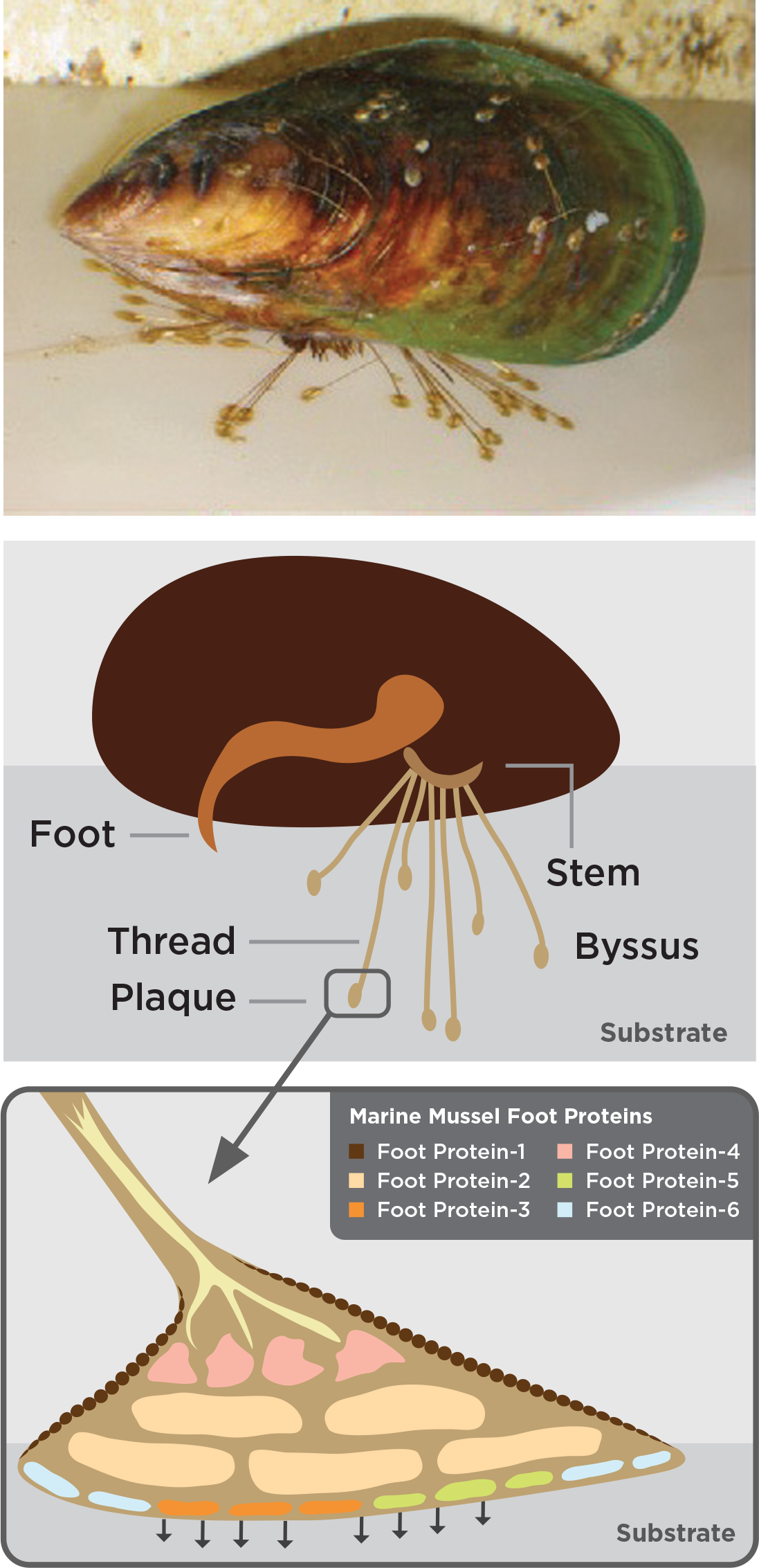 Figure 1. Diagrams of marine mussel attachment to a substrate.