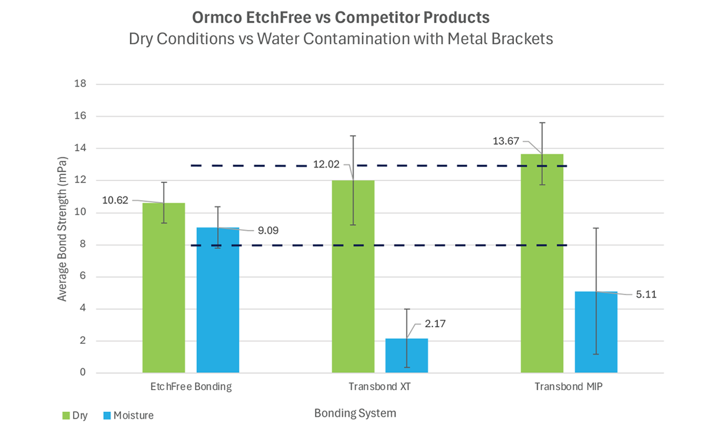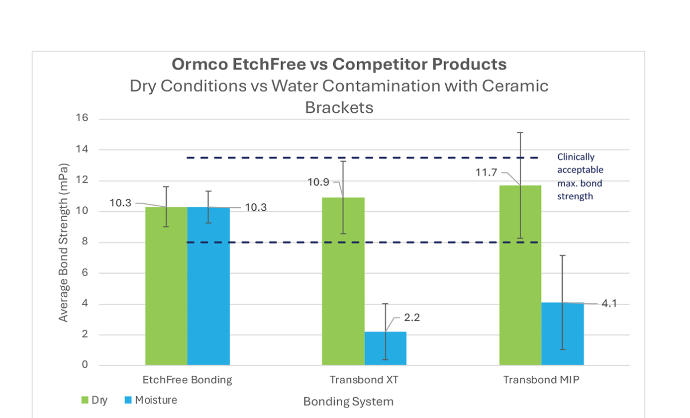 While tests indicate that competing products can have a higher bond strength average in dry conditions, the statistical variance has a greater range than EtchFree Bonding System and reaches the threshold for possible enamel damage. In dry and wet conditions, EtchFree Bonding System maintains a consistent bond strength that meets clinically acceptable thresholds for orthodontic treatment without reaching the threshold of potential enamel damage during debond appointments.