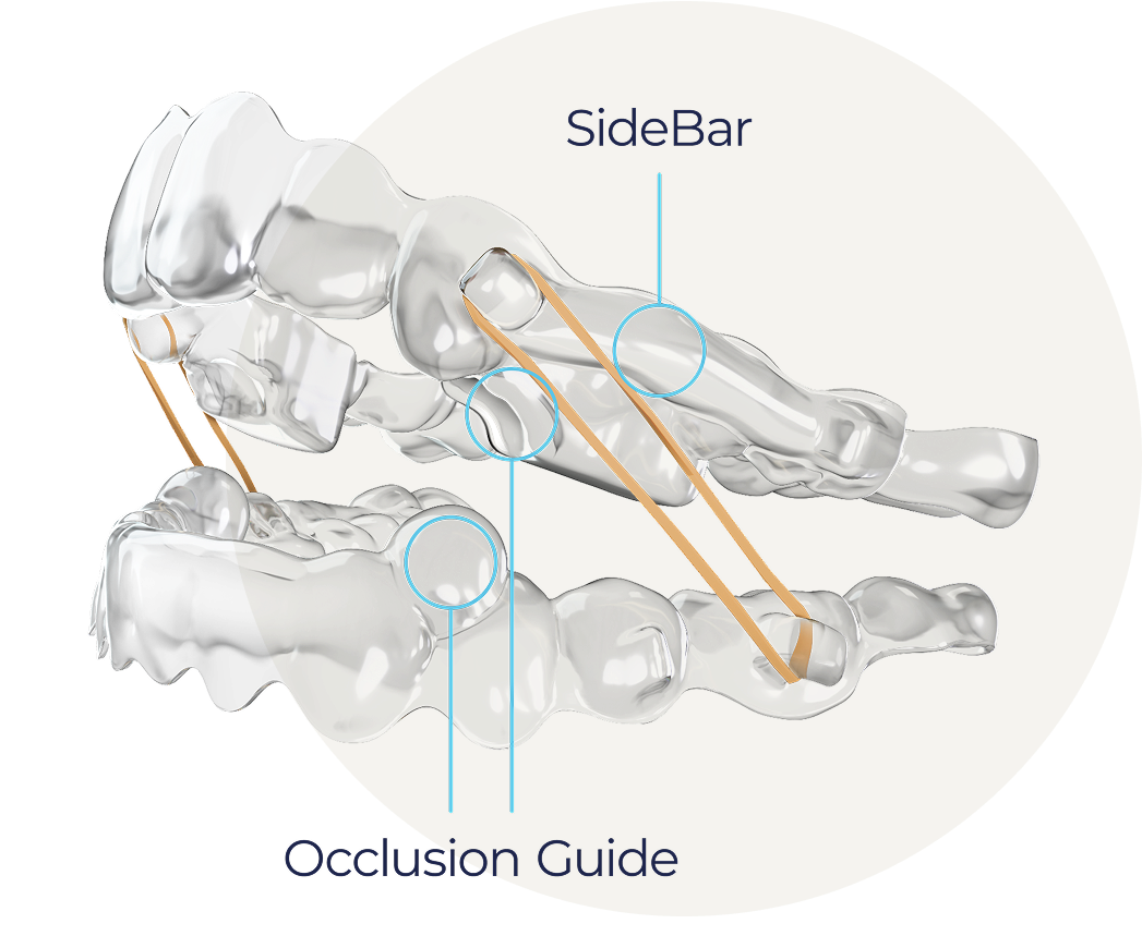 Spark™ BiteSync is a Class II Correction system that delivers synchronized mandibular advancement, maxillary distalization, and dental alignment without the need for a separate appliance. The system consists of an Occlusion Guide and a SideBar, connected and powered by Class II elastics, which can be used together or independently.